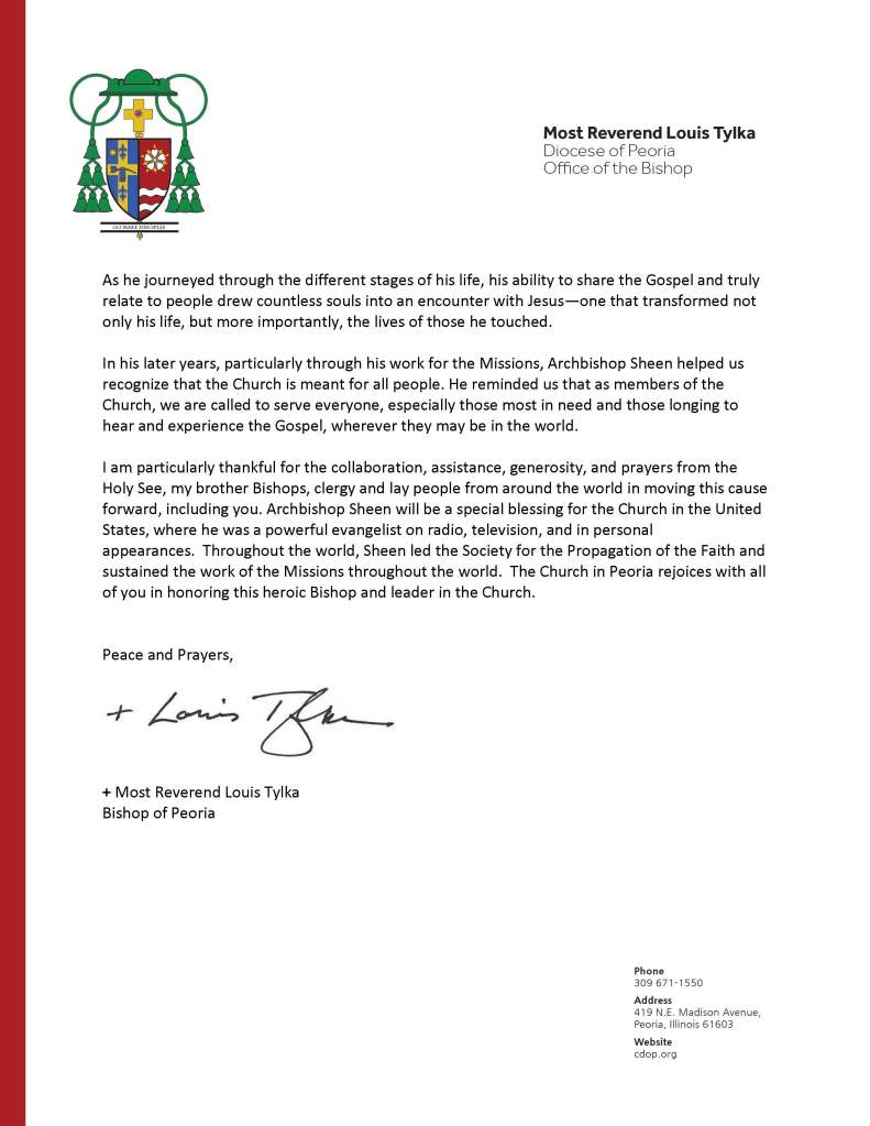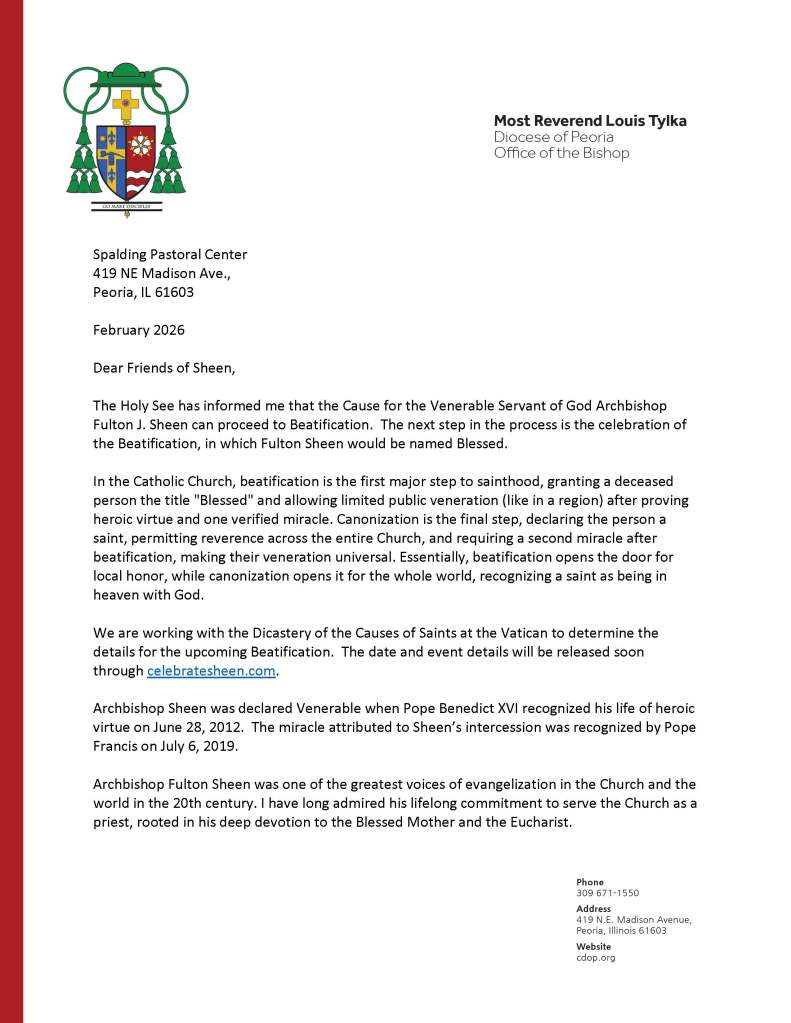 W styczniu 2026 r. obaj hierarchowie, którzy swoimi decyzjami blokowali lub utrudniali proces beatyfikacyjny abpa Sheena – osiągnąwszy wiek emerytalny – zostali decyzją papieża Leona faktycznie przeniesieni na emeryturę, a wspomniane śledztwo nie jest obecnie kontynuowane. Dosłownie kilka dni po tym pojawiła się informacja, którą Christine Niles określa jako całkowicie wiarygodną, o planach przeprowadzenia beatyfikacji arcybiskupa Fultona J. Sheena we wrześniu 2026 r. Z nadzieją czekamy na potwierdzenie tych doniesień i na ogłoszenie daty beatyfikacji.