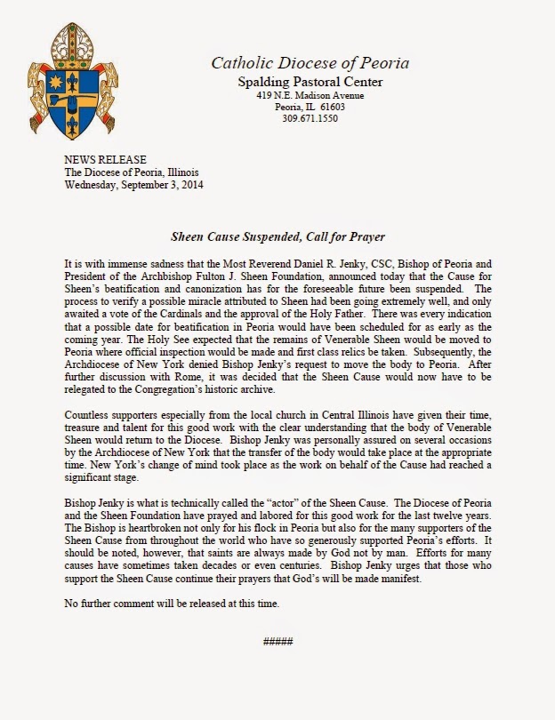 Z ogromnym smutkiem przyjęliśmy do wiadomości, iż Jego Ekscelencja biskup Daniel R. Jenky CSC, biskup Peorii i prezes Fundacji Arcybiskupa Fultona J. Sheena, ogłosił, że proces beatyfikacyjny i kanonizacyjny abpa Sheena został zawieszony na czas nieokreślony. Proces weryfikacji cudu przypisywanego Fultonowi Sheenowi przebiegał niezwykle sprawnie i oczekiwał jedynie na głosowanie Kardynałów oraz aprobatę Ojca Świętego. Wszystko wskazywało na to, iż data beatyfikacji w Peorii zostanie wyznaczona na nadchodzący rok. Stolica Apostolska oczekiwała, że doczesne szczątki Sługi Bożego zostaną przeniesione do Peorii, gdzie zostanie przeprowadzona oficjalna inspekcja oraz pobrane relikwii pierwszej klasy. Następnie Archidiecezja Nowego Jorku odmówiła, gdy biskup Jenky poprosił o przeniesienie ciała do Peorii. Po dalszych rozmowach z Rzymem, zdecydowano, że proces beatyfikacyjny abpa Sheena zostanie przeniesiony do historycznego archiwum Kongregacji [Spraw Kanonizacyjnych].